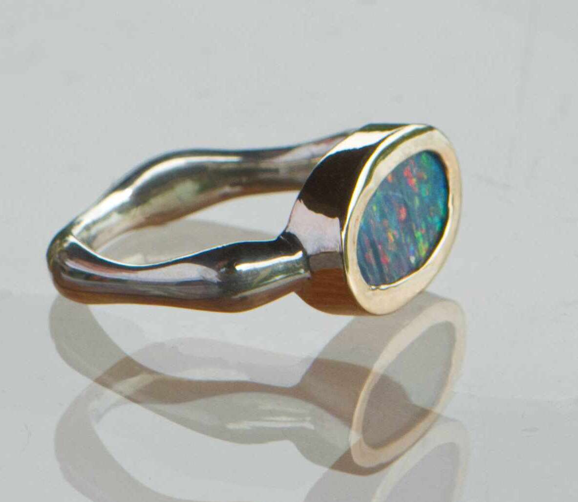 Lightning Ridge fiery red, green and blue opal. This highly original design protects the large stone with its over sized gold frame. Handmade in our workshop using a plate of 9Kt Yellow Gold over sterling silver to great effect. The organic form in the band fits comfortably around the hand. The stone measures 12x7mm. Outside measures 15.5×10.6mm This piece celebrates the innovative nature of the best design from Ixtlan Jewellery. Suitable for constant wear.