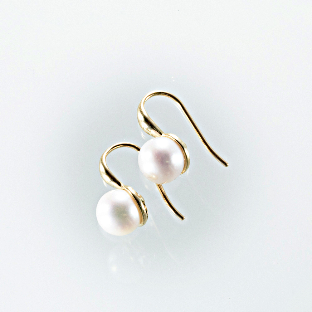 Rose Gold in 9Kt compliments the alabaster white of these fine pearls. The overall length is 18mm front and 21mm hook. The pearls are 8mm and suitable for daily use. The back has a blossom motif to hold the pearl and the body bears the Initiatory Current insignia for excellence in design and manufacture from Fellin for Ixtlan Jewellery.